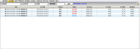 由交易頁面"群組按鈕"的「證券」點選「成交回報」。 |