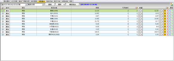 )按鈕,由下拉式選單選擇 「全部選取」、「融資選取」、「現股選取」、「全部清除」、「全部市價」選項。