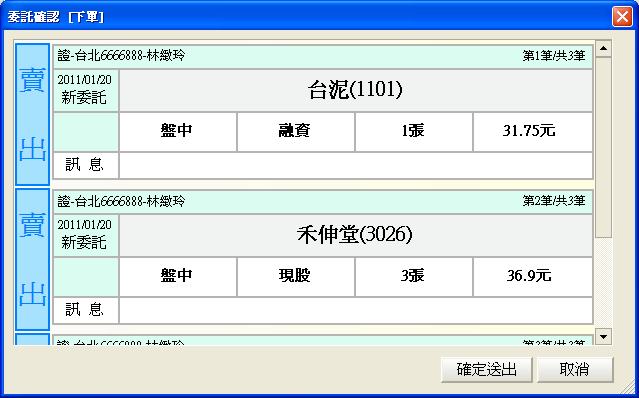即可送出委託;若按下〔取消〕鈕, 則取消此筆委託單的送出動作。
