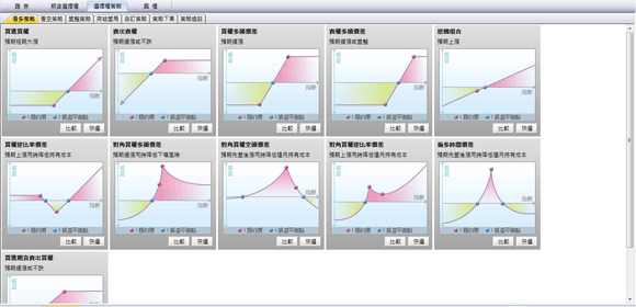 〔看多策略〕提供11種交易方式 :〔買進買權〕、〔賣出賣權〕、〔買權多頭價差〕、〔賣權多頭價差〕、〔逆轉組合〕 |