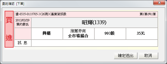 系統會彈出「此單筆委託確認」下單對話盒如下圖,按下〔確定送出〕鈕,即可送出委託;若按下〔取消〕鈕,則取消此筆委託單的送出動作。 |