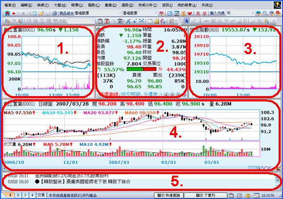 - 點選主功能列中「個股」,接著選取「香港個股走勢分析」,再選取「個股走勢與K線對應」。