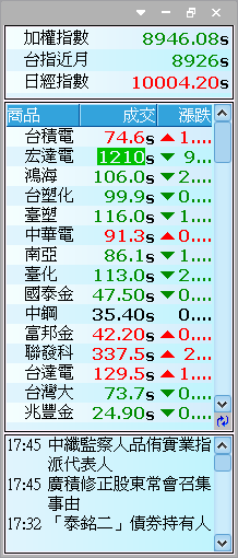 在完整畫面的情形下,輸入迷你報價鍵(ex.CTRL+F1)或是點選功能列上的[切換迷你報價]按鈕(),報價畫面就會以迷你報價的方式呈現。再次輸入迷你報價鍵(ex.CTRL+F1),報價畫面就會回復正常。