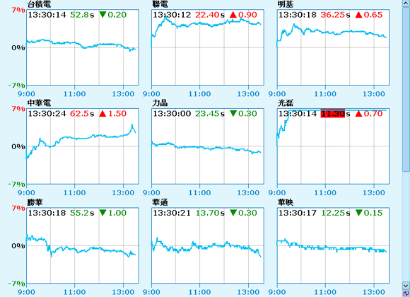 | 可同時看到多個商品的即時走勢圖,使商品的漲跌強弱幅度一目了然。 |