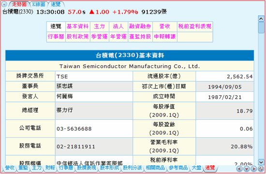 會依商品而有不同內容,以台股為例,包含:基本資料、主力、法人、融資融券、營收、稅前盈利表現、行事曆、股利分派、季營運、年營運、董監持股、申報轉讓。