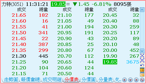 - 以紅色標示,表示該價位較昨收價上漲,紅框白(或黑)字體者,表示該價位是今日的漲停板價位。以綠色標示,表示該價位較昨收價下跌,綠框白(或黑)字體者,表示該價位是今日的跌停板價位。以藍色標示,表示目前的價位。昨收價則是以黑色(或白色,視背景色系而異)標示。