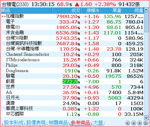 ]表較前一價格下跌、[=]表與前一價格持平、[S]表示己收盤,該數值為收盤價。