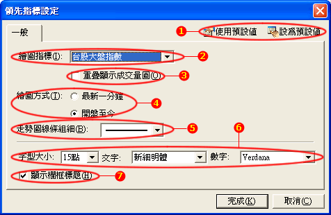 將已顯示[領先指標]內容,變更參數設定。進入設定頁面方式:在作用欄框中,按滑鼠右鍵,選取[設定]。
