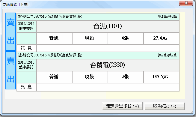 即可送出委託;若按下〔取消〕鈕, 則取消此筆委託單的送出動作。