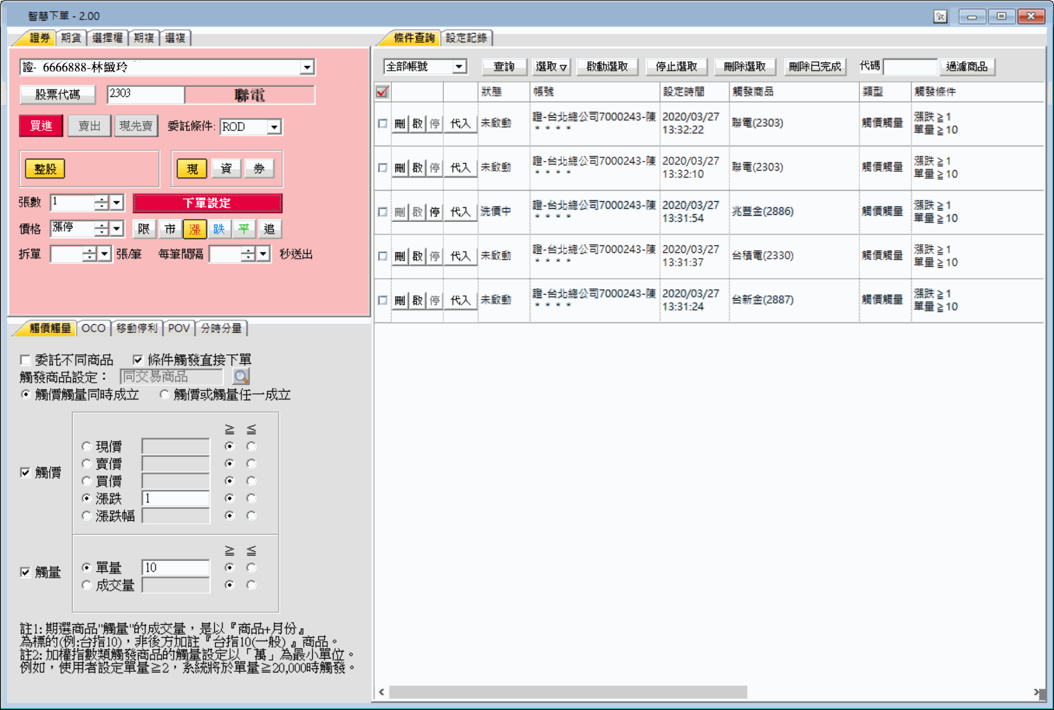 可由( )設定觸價、觸量同時成立才觸發或觸價、觸量只要任一成立即觸發。 |