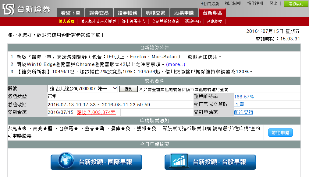 1. 台新證券下單交易系統的頁面配置如下: