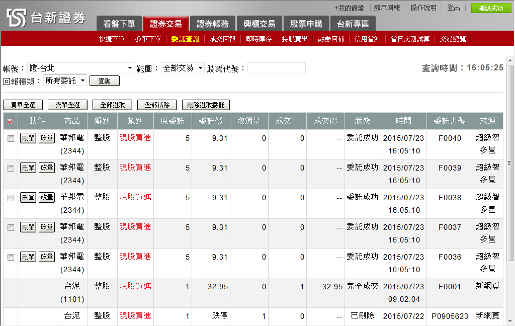 ( )由下拉式選單選擇查詢「所有委託」、「委託成功」、「委託失敗」、「全部成交」選項。 |