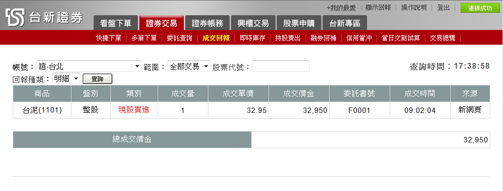 點選系統的〔證券交易〕按鈕,再點選〔成交回報〕標籤。