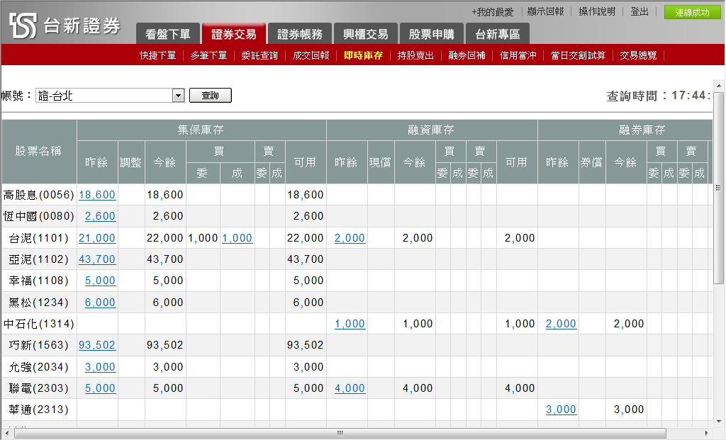 點選系統的〔證券交易〕按鈕,再點選〔即時庫存〕標籤。