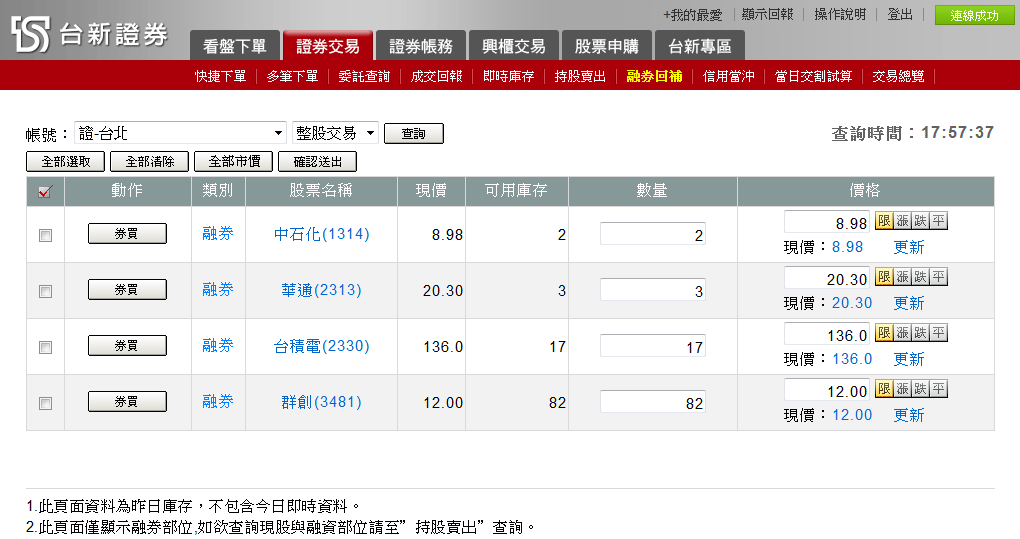 以滑鼠左鍵點擊「動作」欄位的( )按鈕,可以單筆委託的方式回補融券部位。 |