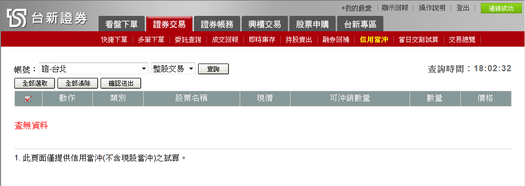 「交易確認」視窗,按下〔送出〕鈕,即可送出委託;若按下〔取消〕鈕,則「取消」本筆委託。 |