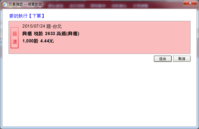 以滑鼠左鍵點擊( )按鈕,會彈出「交易確認」視窗如下圖,按下〔確認送出〕鈕,即可送出委託; |