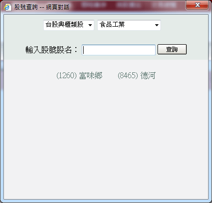 ,按下〔查詢〕按鈕,系統會進行模糊搜尋,搜尋出相關的股票名稱。 |