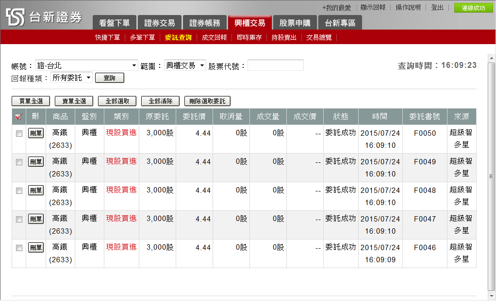 ( )由下拉式選單選擇查詢「所有委託」、「委託成功」、「委託失敗」、「全部成交」選項。 |