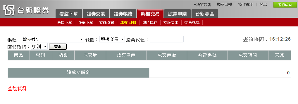 點選系統的〔興櫃交易〕按鈕,再點選〔成交回報〕標籤。