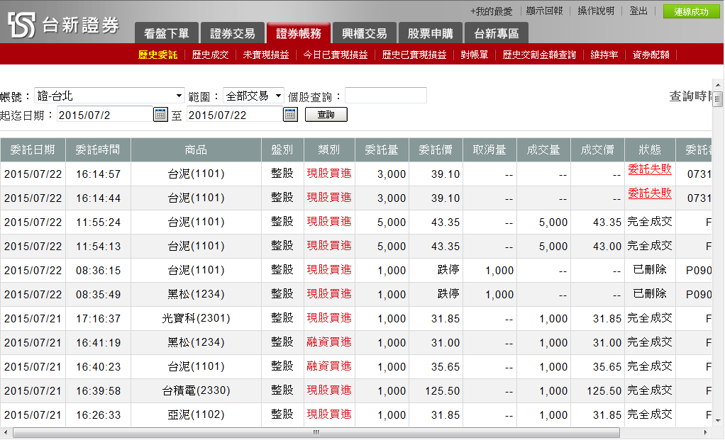 點選系統的〔證券帳務〕按鈕,再點選〔歷史委託〕標籤。