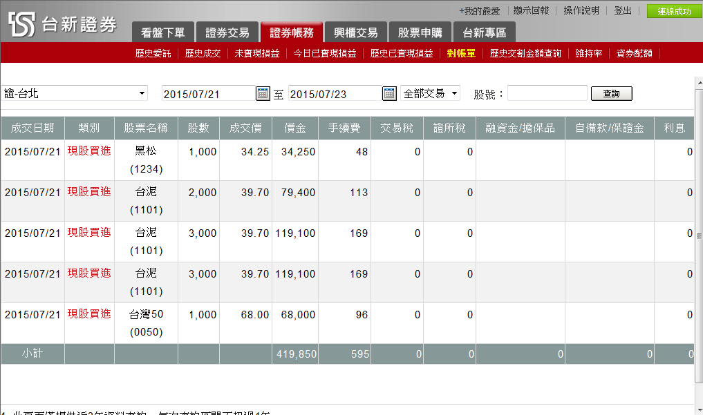 點選系統的〔證券帳務〕按鈕,再點選〔對帳單〕標籤。