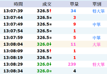單別:會以文字揭示大單,特大單。空白表示小單。單別定義,會依照市場的交易狀態作調整。