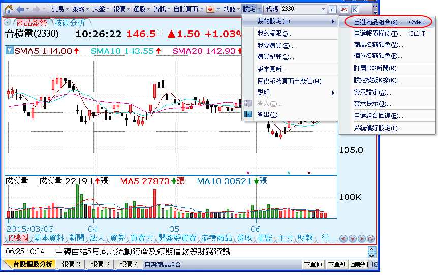 - 點選主功能列中[設定]中[我的設定],再點選[自選商品組合]。
