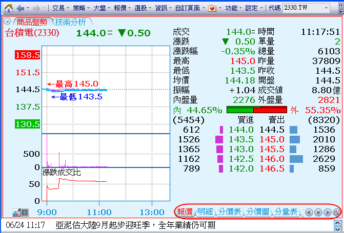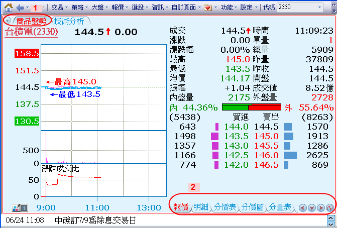 直接在鍵盤輸入股票名稱或代碼,按[Enter],即可切換至該商品的商品盤勢資訊。