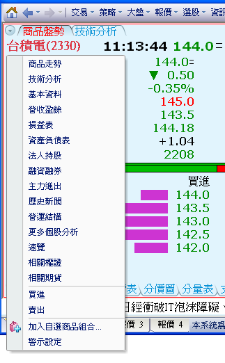 點選商品名稱,用滑鼠按右鍵,出現選單功能,可連結商品走勢、技術分析、深入分析功能頁,與將該商品加入自選商品組合,如下圖所示。