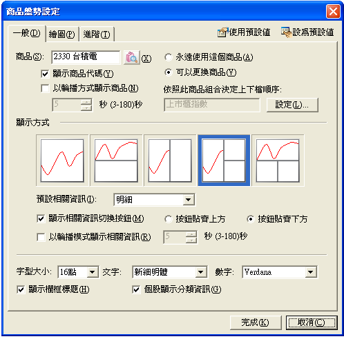 顯示欄框標題:若沒有勾選[顯示欄框標題]選項,呈現出來的頁面在左上方會看不到商品名稱及最新成交價的訊息。