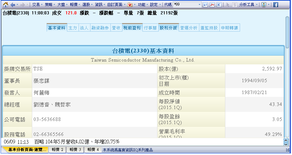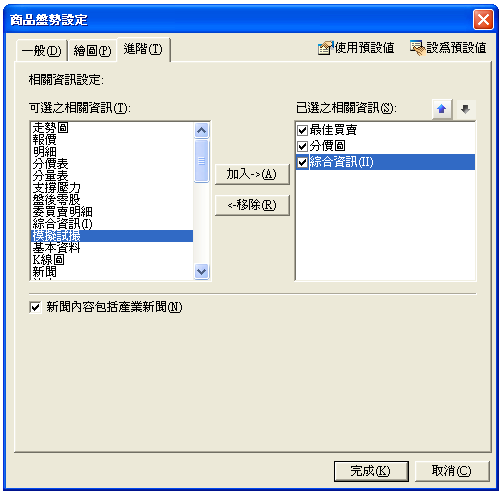 預設相關資訊:包括:成交明細、分價表、分價圖、分量表、支撐壓力、最佳買賣、委買賣明細、基本資料、董監、股利分派、股本形成、股價表現、K線圖、新聞、法人、資券、買賣力、開盤委買賣、營收、主力、財報、行事曆、相關商品、參考商品、大盤、速覽、持股、衍生委託單。但資訊項目會因商品不同,所能支援的項目也因此不同。