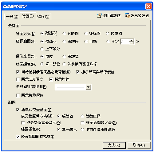 繪製相關即時指標:若勾選,表示要顯示即時指標。往後,只要在商品盤勢作用欄框中,按滑鼠右鍵,點選[即時指標],即可挑選要出現的指標。有關指標商品,請參考附錄B。