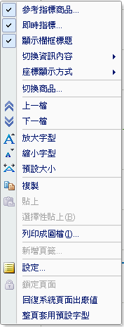 在走勢圖上按滑鼠右鍵,會出現一快速切換選單,可以經由此選單,啟動輔助功能。