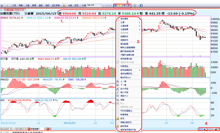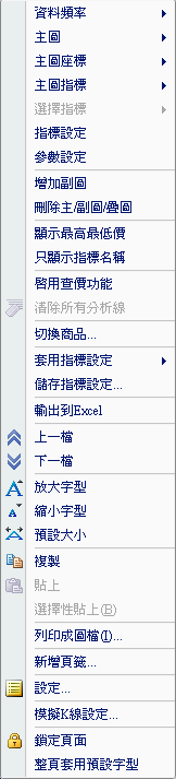- 在畫面上按滑鼠右鍵,會出現功能選單,可以切換資料頻率、主圖類型、副圖類型等項目。