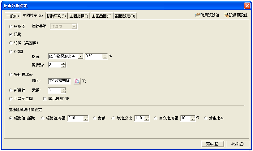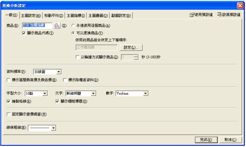 - 接著會跳出對話盒,相關設定分別列示在[一般]、[主圖設定]、[主圖指標]、[副圖設定]的Tab內,以供修改。
