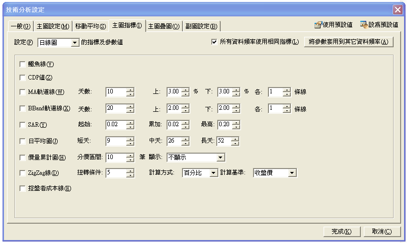 - 主圖指標:選定重疊繪製於主圖上的指標參數。打勾者,表示目前顯示於主圖上。
