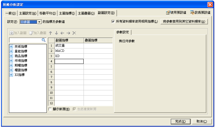 副圖設定:設定不同資料頻率的副圖技術指標及屬性。以表
