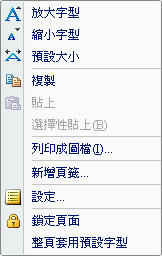- 放大/縮小/預設字型:讓使用者調整作用欄框中的字型大小。