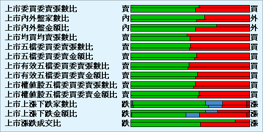 上方為最近15分鐘內的跌停/下跌/平盤/上漲/漲停金額的百分比。下方為開盤至今跌停/下跌/平盤/上漲/漲停金額的百分比。 |