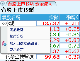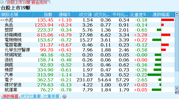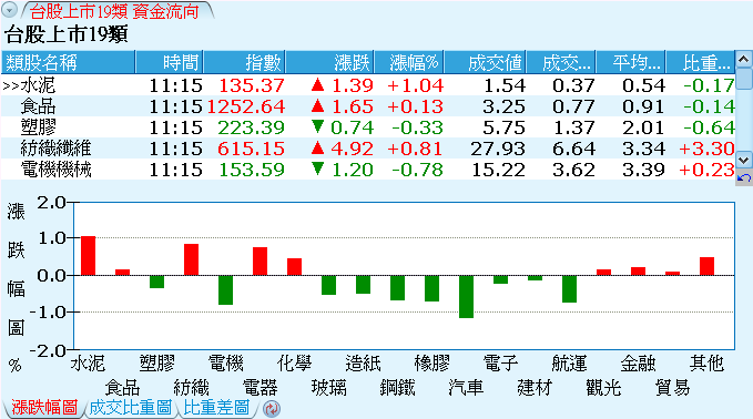 把游標移至漲跌幅、成交比重、比重差圖中任一柱狀上方便會出現詳細的數字資料,點擊該柱狀後便會傳送代碼至商品查詢的工具列中。