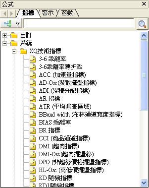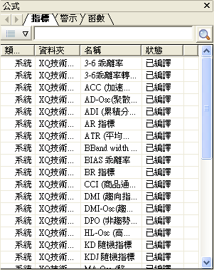 籤區: 依公式腳本的類型分為三個頁籤,「指標」、「警示」及「函數」。