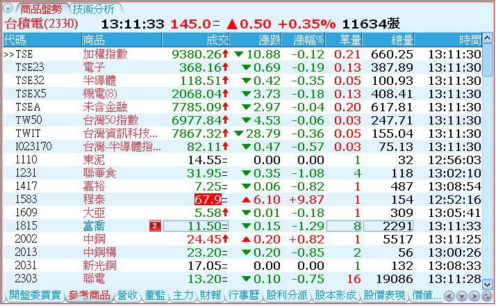 列示與該商品有關的大盤指數以及同產業的前十大個股。
