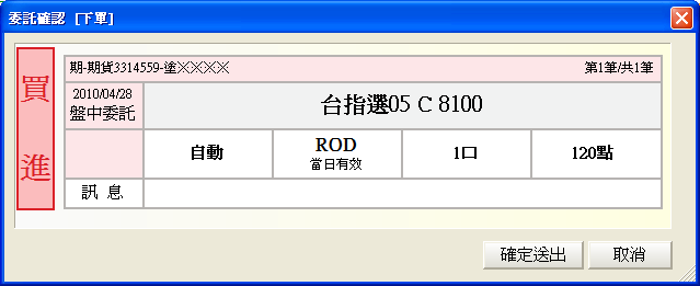 鈕,會彈出「委託確認」下單對話盒,按下〔確定送出〕鈕,即可送出委託;若按下〔取消〕鈕,則取消此筆委託單的送出動作。 |
