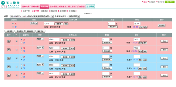 )按鈕, 可將上方下單列所選擇的委託內容複製至下方的多筆下單列中。