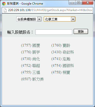 點選〔查股號〕按鈕會依所選市場彈出該市場的「股號查詢」小視窗,可以在小視窗選擇類股,再選取想要交易的股票,系統會把所點選的股票代碼帶到 下單介面的「輸入欄」內; 也可以在「輸入股號股名」欄輸入「股票名稱」或「股票代碼」,按下〔查詢〕按鈕,搜尋出所輸入的「股票名稱」及「股票代碼」。