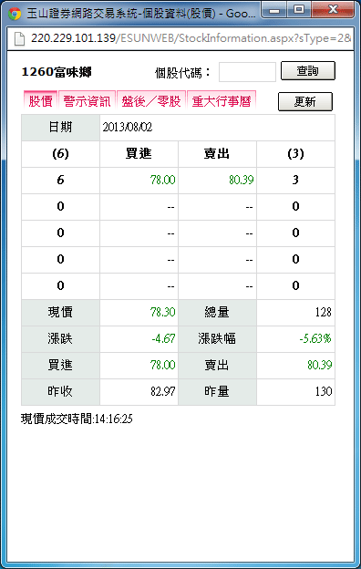 )以滑鼠左鍵點擊「更新」,系統會更新所顯示的「現價」;(