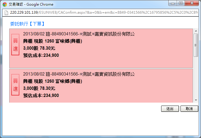 )按鈕,可將工作表內核取方塊已勾選的委託資料「送出」,同時彈出 「交易確認」小視窗如下圖,按下〔送出〕鈕,即可送出委託;若按下〔取消〕鈕,則「取消」本筆委託。