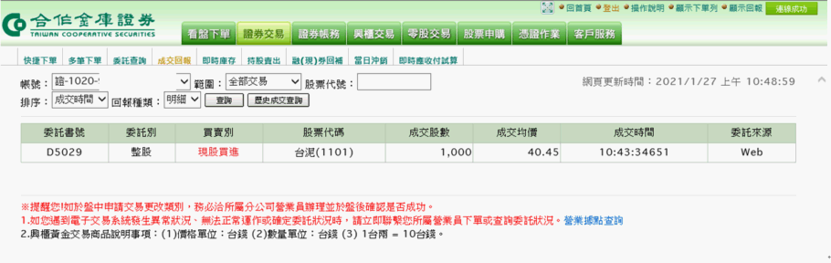 點選系統的〔證券交易〕按鈕,再點選〔成交回報〕標籤。