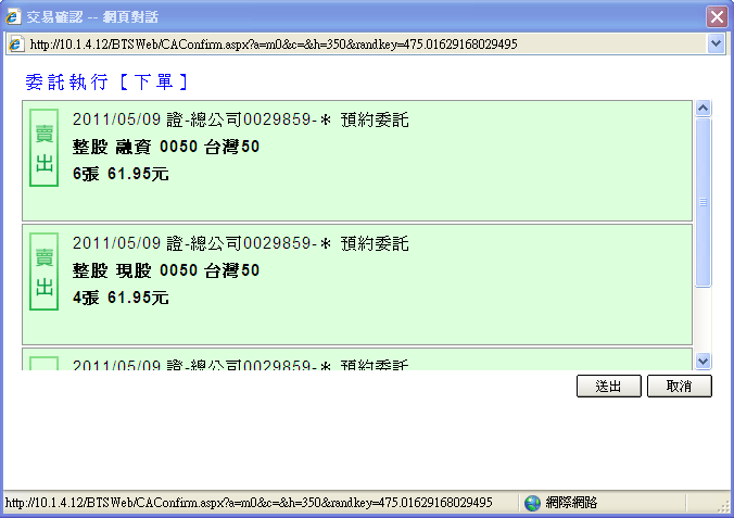 )按鈕,可將持股賣出內已勾選的資料以賣出委託送出,系統同時彈出「交易確認」視窗,若按下〔取消〕鈕,則「取消」本筆委託。
